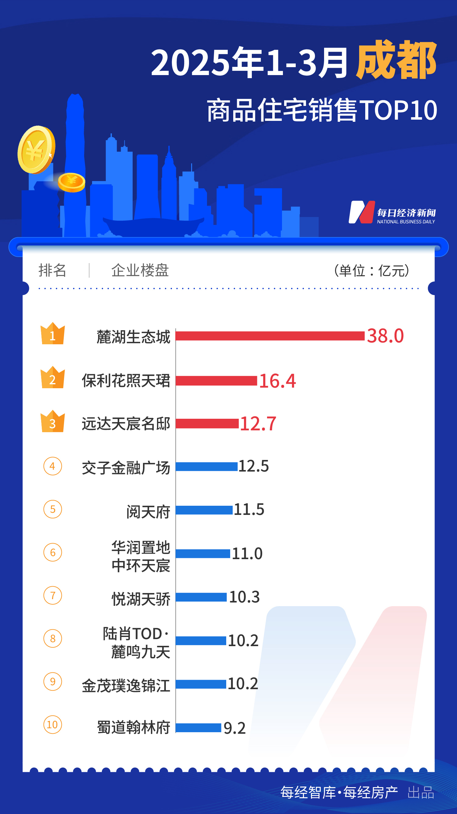 此外,成都TOP10楼盘的总销售额达到141.8亿元,位居第五,与深圳的差距仅为30亿元。在成都TOP10楼盘中,有9个项目的销售额超过10亿元。
